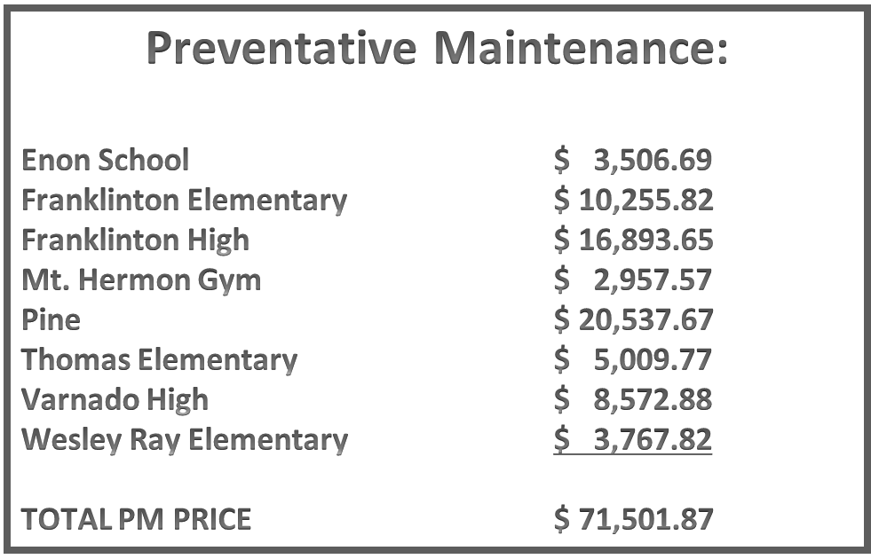 It was moved by John Breland, seconded by Dewitt Perry, that the Board renew the preventive maintenance contract of Morgan Mechanical as follows: